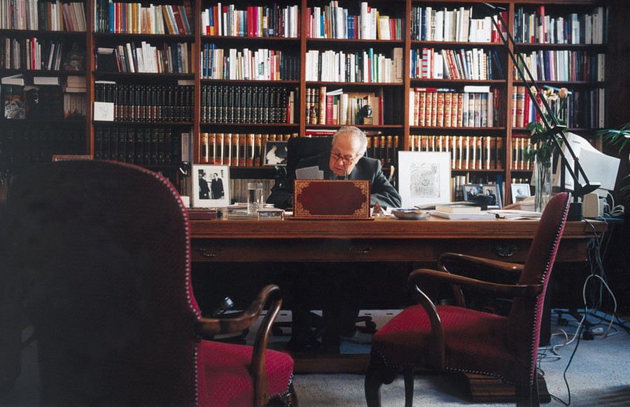 Nos anos do fim, quando quase tudo nele deixava de ser o que fora, isso ainda lhe era um ponto de aplicação, onde, como Arquimedes, se apoiava para erguer o seu mundo. Depois da conversa na sala, levava ali os que o visitavam. Agora, estamos no escritório. Ele, com a mão incerta, aponta na estante as prateleiras dos livros que, desde jovem, foi publicando e diz: “Com uma vida tão atribulada, ainda consegui escrever alguns livros.” São uma centena, com as traduções. E há na sua voz um orgulho triste. Esse orgulho olha o passado e não o futuro, por saber que já não é possível acrescentar livros novos àquela longa fila deles.