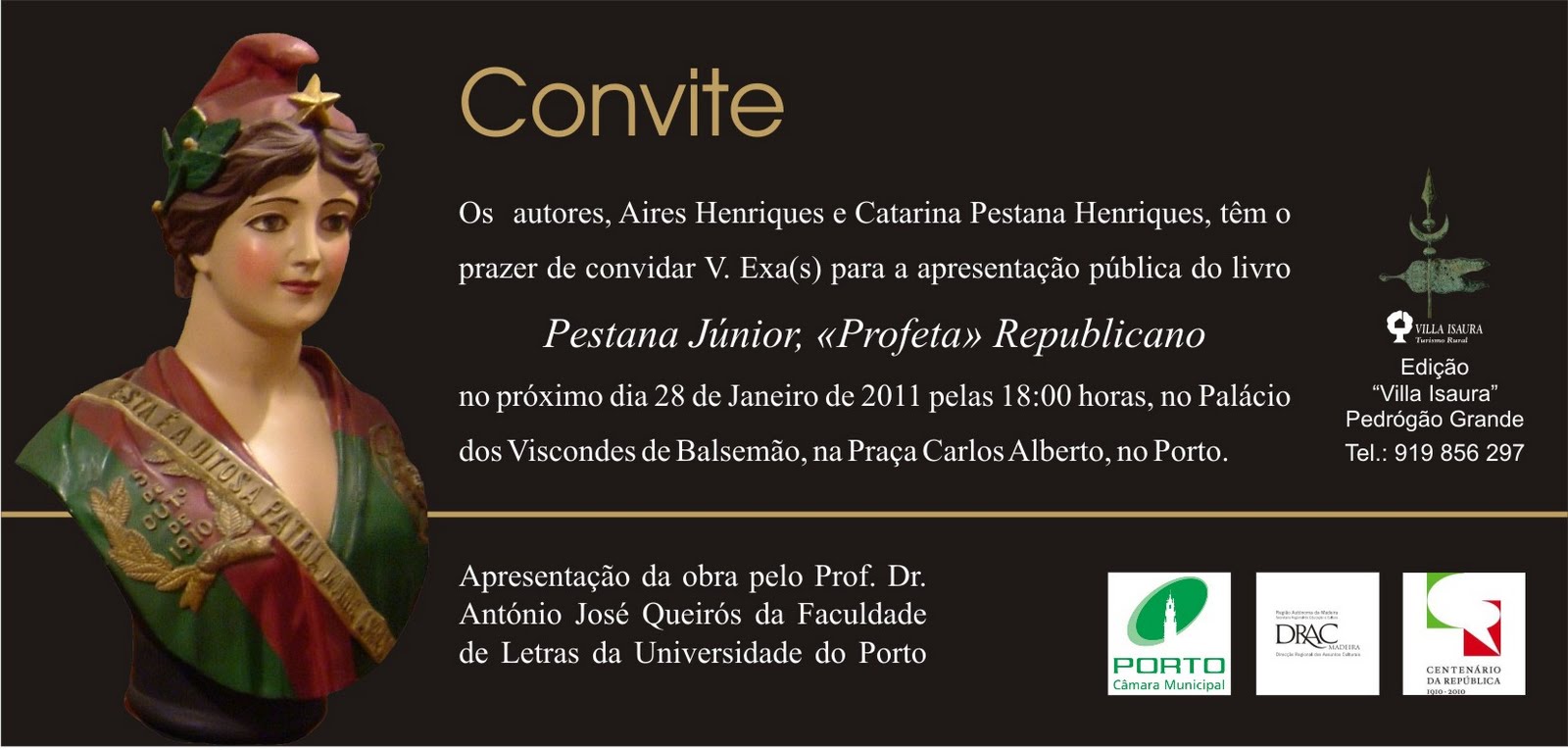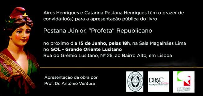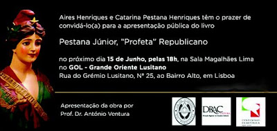 O “trabalho biográfico” – Pestana Júnior «Profeta» Republicano - de Aires B. Henriques [contacto via Facebook] e Catarina Pestana Henriques [bisneta do biografado] sobre a figura inolvidável de Manuel Gregório Pestana Júnior, natural de Porto Santo [impoluto republicano, um dos intransigentes da Greve de 1907 de Coimbra, maçon e antigo carbonário, publicista e advogado, deputado Constituinte e ministro da I República, e depois um dos resistentes e combatentes contra a Ditadura militar e salazarista, pagando por isso a prisão e o desterro], e que AQUI e AQUI referenciámos, será apresentado (homenageado) em Lisboa no próximo dia 15 de Junho, justamente na Sala Magalhães Lima do Grémio Lusitano. A apresentação estará a carga do prof. António Ventura.